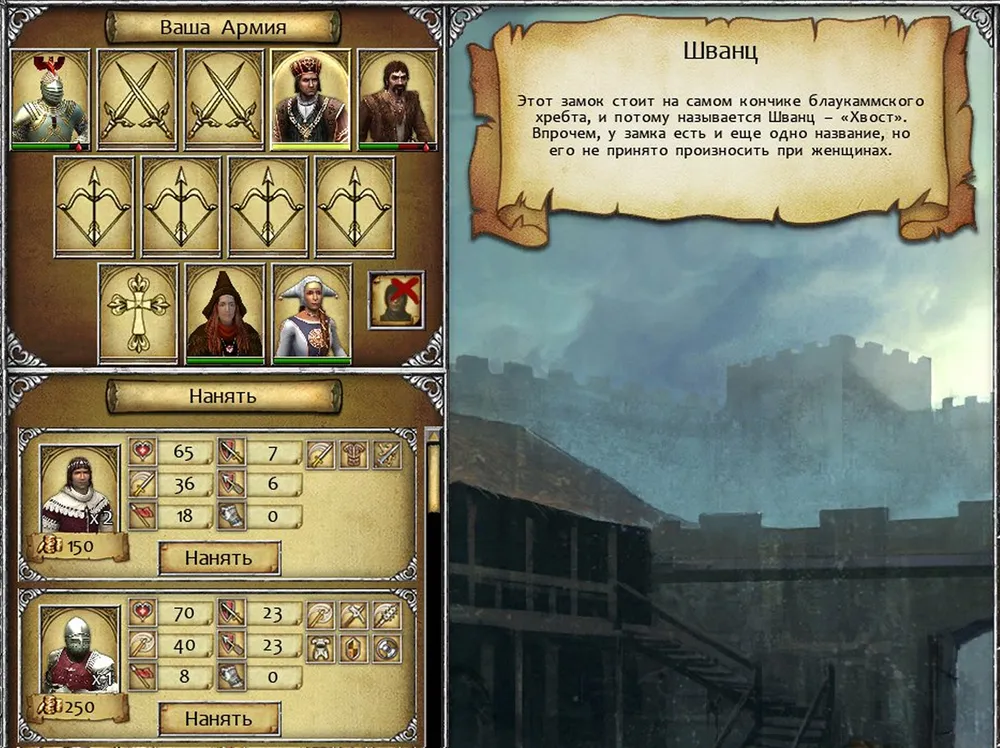 Добыли усадьбу, получив в качестве довеска несколько сопартийцев, – можно начинать комплектацию войска, необходимого для усмирения местных дворян. Наиболее перспективным в этом плане является замок Шванц, где можно нанять сразу трёх молодых дворян.