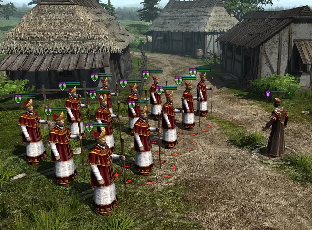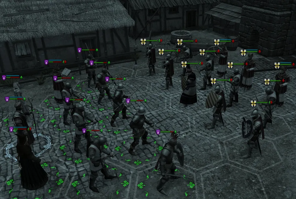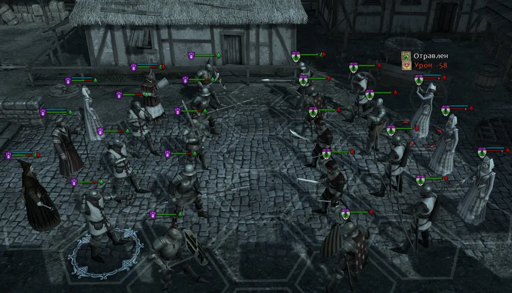Теперь – Диоцез. Тоже ночью, предельно осторожно: предстоит два боя подряд, гибель единственного бойца в первом поставит под сомнение успех во втором. Самые опасные враги – с двуручным оружием, весь огонь лучников на них. (Епископы, даже будучи отравленными, всё равно успеют применить свою магию, усилив соратников. Таких ударов воины Мистика не выдержат!) Против них же ставятся все рыцари: добить любой ценой! На другом фланге пикинёры принимают контратакующие стойки, заставляя врага обороняться. Если удалось уничтожить этих двоих, остальное дело техники.