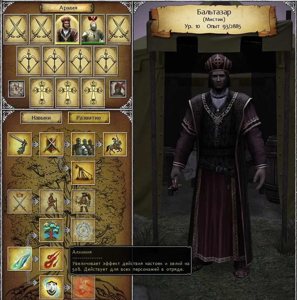 К счастью, оставалось несколько строений, заполненных только епископами, они и принесли герою долгожданный десятый уровень… Что берём? «Алхимию», конечно; очень скоро герою понадобится «призрачная поддержка».