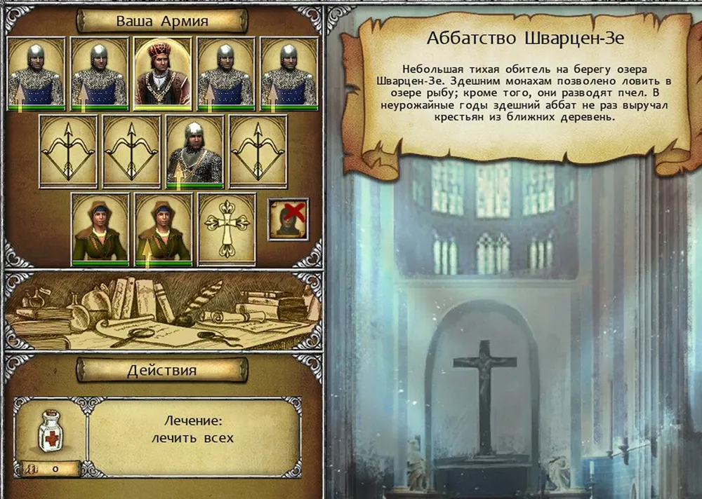 Начало неплохое: два стражника; есть кое-какие предметы, можно увеличить отряд. Первым делом спешим на штурм замка Глатце, пока его гарнизон не усилился; что и проходит с успехом. Призываем на помощь Олле и захватываем второй замок, Хохенфельц, мистик, по обыкновению, погибает; дело решает последний полуживой стражник.