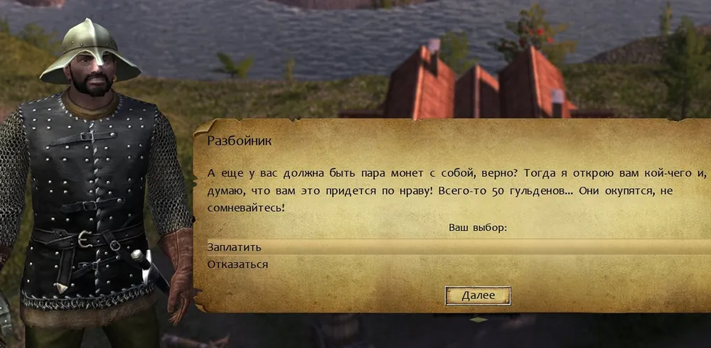 Посетив ярмарку и купив снаряжение, не торопитесь в таверну: после диалогов в ней появится отряд разбойников, если затянуть время, они успеют получить новые уровни; справиться будет крайне тяжело. Подождите до следующего утра – вдруг в продаже найдётся что-то более интересное? Важно приобрести для героя максимально мощный щит и доспехи; причём минус к инициативе не имеет значения; главное уровень защиты. В будущем пригодится щит-павеза и арбалет; лёгкая броня и шлемы. Также нужны любые зелья, подешевле; но об этом чуть позже.