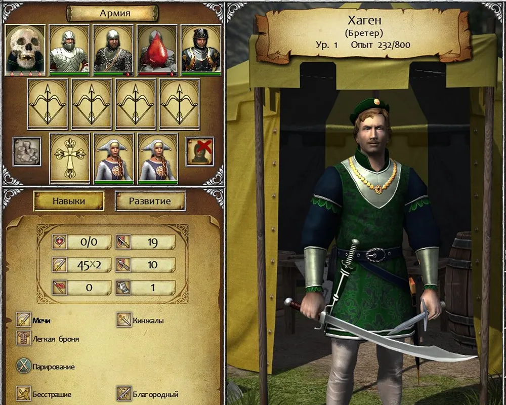 Я сразу взял умение «Командир»; но стоило начинать не с него, а с «Феодала»; очень скоро это умение (позволяющее взимать налоги сразу за пять дней и дешевле платить за наёмников) окажется крайне востребованным.