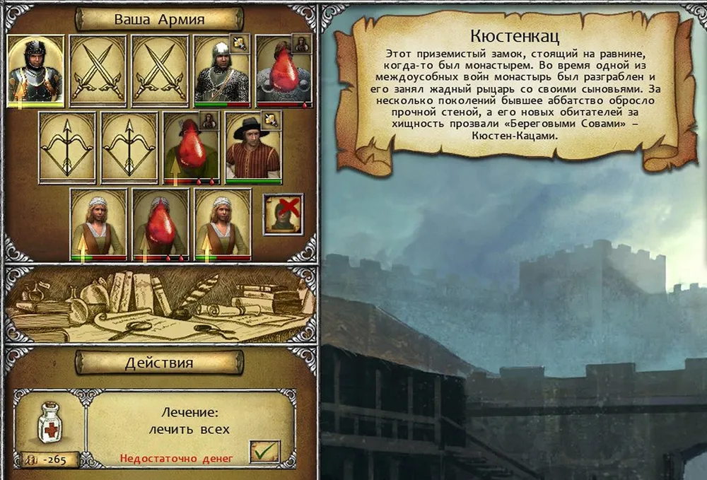 Беседуем с посетителями таверны и атакуем бандитский отряд. Если легко справляетесь существующим отрядом, можно загрузить игру и уменьшить численность, уволив нанятого в замке воина. (Правда, опыта всё равно получится крайне мало.) Следующий этап - штурм замка Кюстенканц. Увы, в его гарнизоне обычно два-три копейщика, обладатели смертельного для ваших воинов умения «Контратака». Раздаём бойцам первой шеренги закупленное снаряжение, а также – зелья; всё равно, какие.