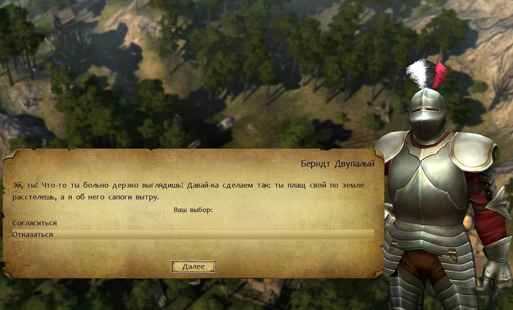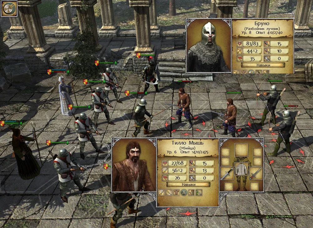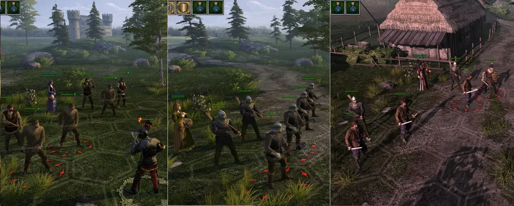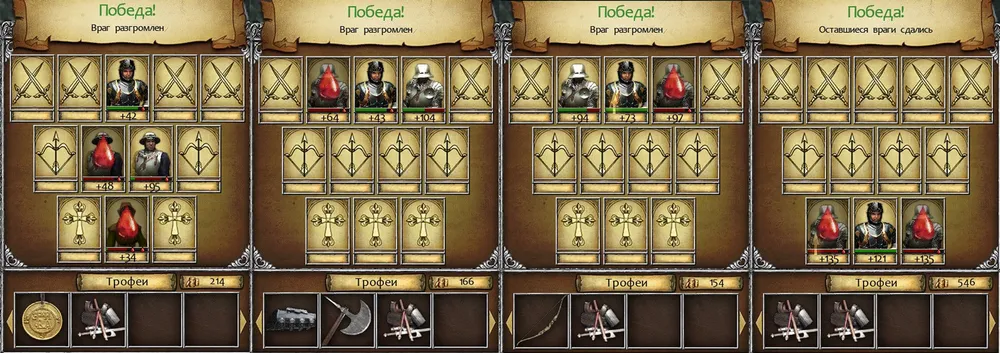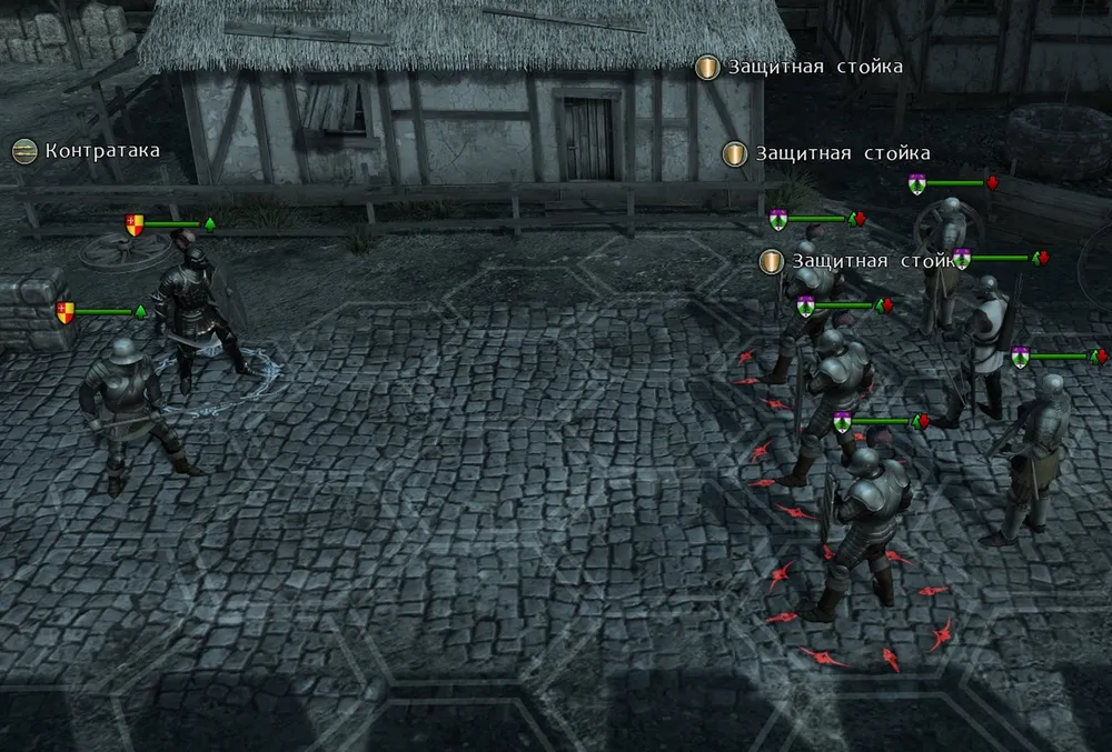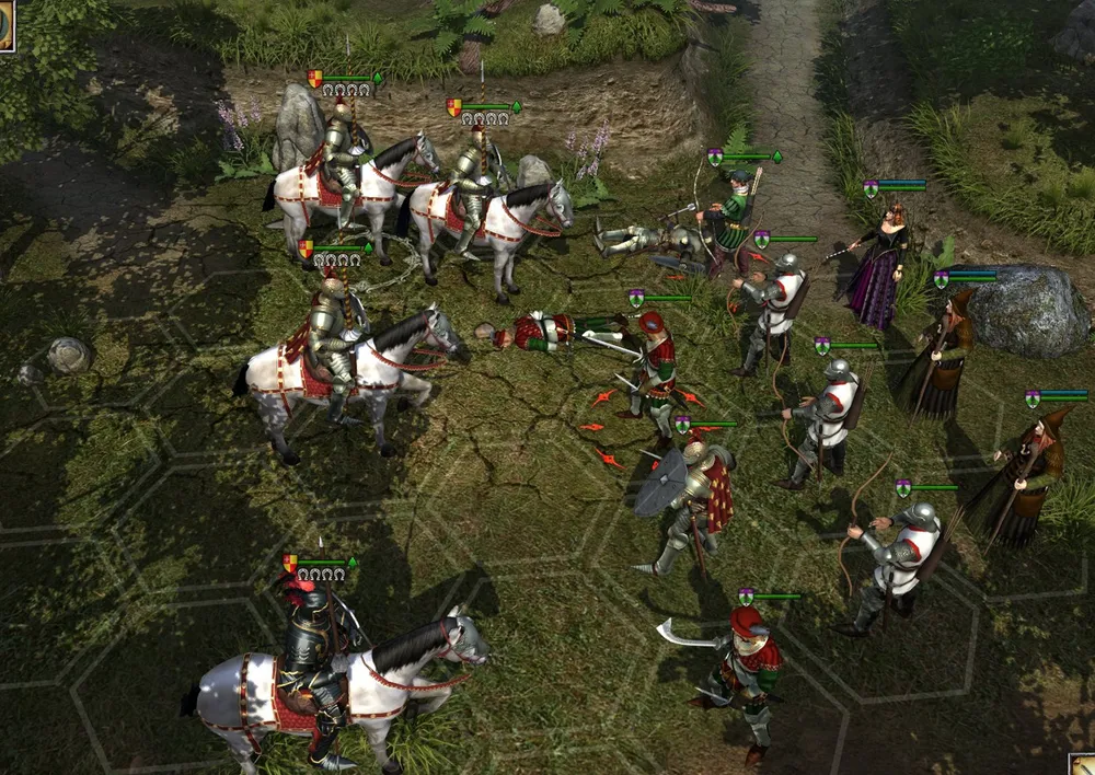 Рыцарь вынужден принимать лечебное зелье и пропускает ход; пикинёра добивают стрелки. К тому моменту, как рыцарь справляется с врагами ближнего боя, он остаётся в одиночестве. Стрелки врага довершают начатое. Что я только ни делал: менял позиции, ставя пикинёров рядом друг с другом; применял зелья усиления ударов – враг атаковал настолько искусно, что создавалось полное впечатление о противостоянии живому противнику: каждый раз его тактика была разной; с неизменным результатом. С большим трудом победить удалось только ночью; и, разумеется, арбалетчик и лучник сбежали. Тьфу! (Вообще, побеги и сдача врагов в плен – непрекращающийся источник крайнего раздражения. Тем более, что уходят от возмездия, как правило, самые зловредные враги.)