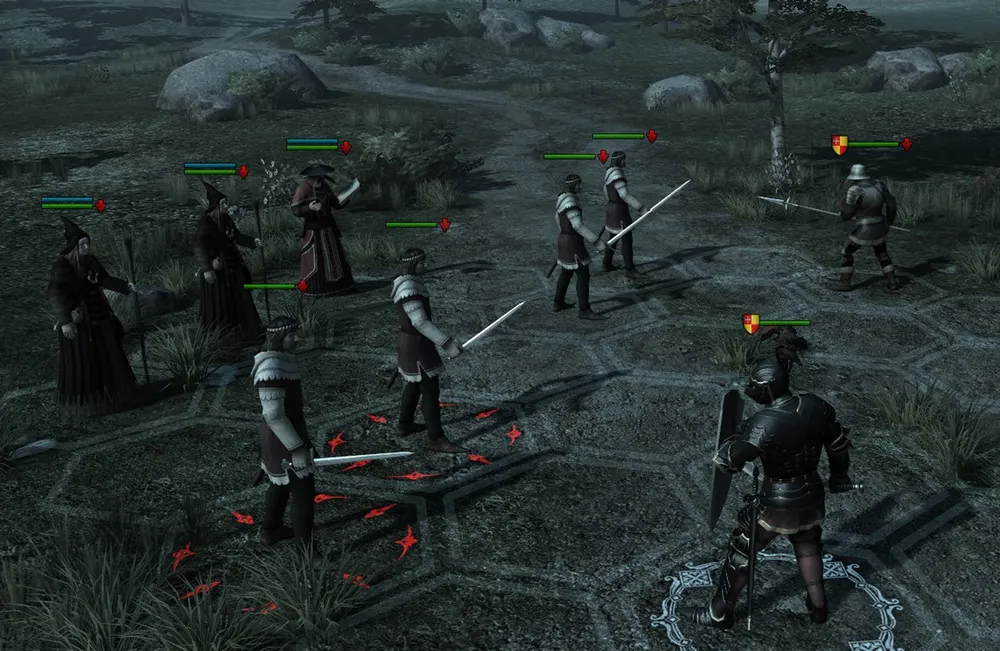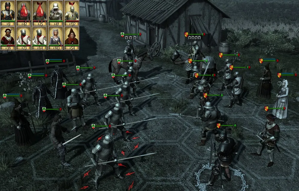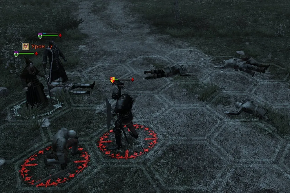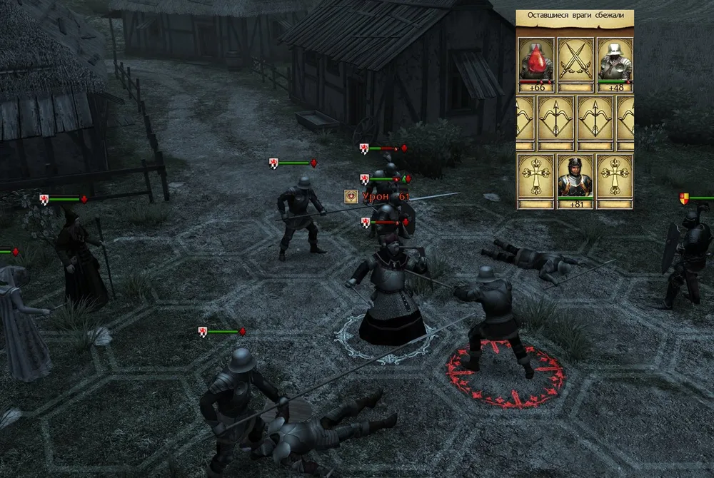 Добро, атакуем втроём, даже без медика: у двоих в отряде есть предметы экипировки с магическим восстановлением; у пикинёров – копья со способностью «Уворот», а уровень защиты рыцаря – 48. Правда, смущает, что враги почему-то все без исключения – последних уровней. Инквизиторы, рыцари, пехотинцы-ветераны, почти в каждом отряде – ведьмы, некроманты или ересиархи. А то и все сразу. Для примера - два боя.