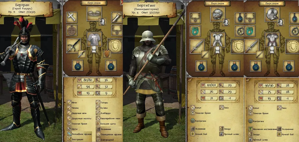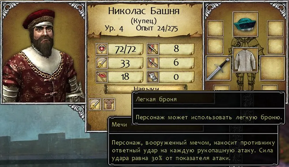 Между делом я проверил, что будут представлять собой два наёмника: купец и некромант. Вдруг по мере роста они приобретут уникальные свойства? Увы, купец так и остался мечником в лёгкой броне без щита (я нанял его на пристани рядом с Виндфельдом)