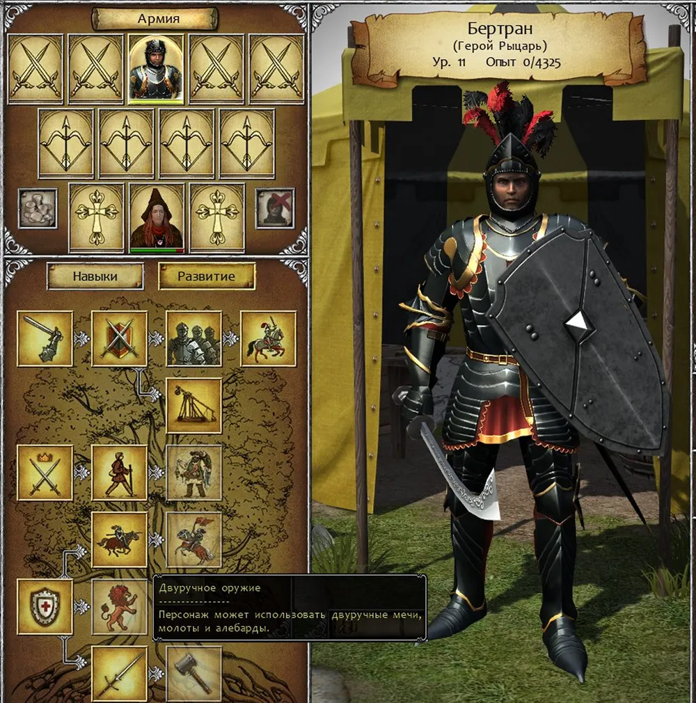 Наконец-то одиннадцатый уровень! Какую способность взять? (На десятом я взял конный бой – не упускать же возможность забрать с собой камарга, седло и копьё.) Возможно, стоило разрешить герою наносить два удара верхом, но я предпочёл двуручное оружие: в запасе был чрезвычайно сильный двуручник.