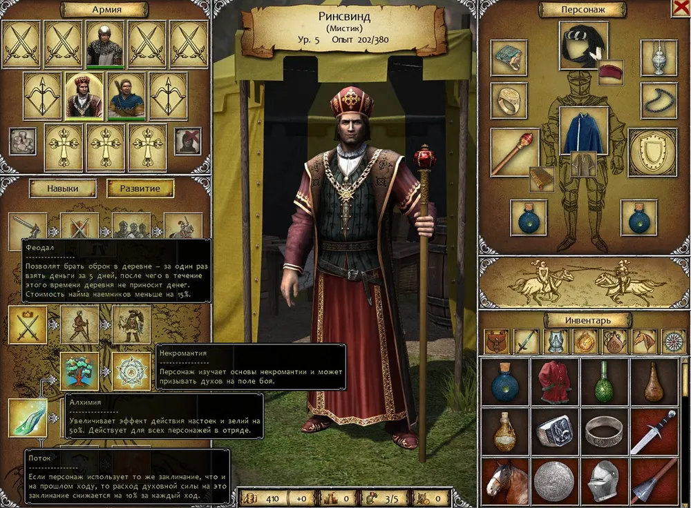 Для того, чтобы без помех накапливать опыт, необходимо обзавестись хорошей защитой. Ринсвинду абсолютно необходимы два тяжёлых бойца в первой линии и один-два лучника во второй. Клирики? Плавали, знаем: никакие клирики не спасут, если враг сосредотачивает весь огонь на их подопечном.