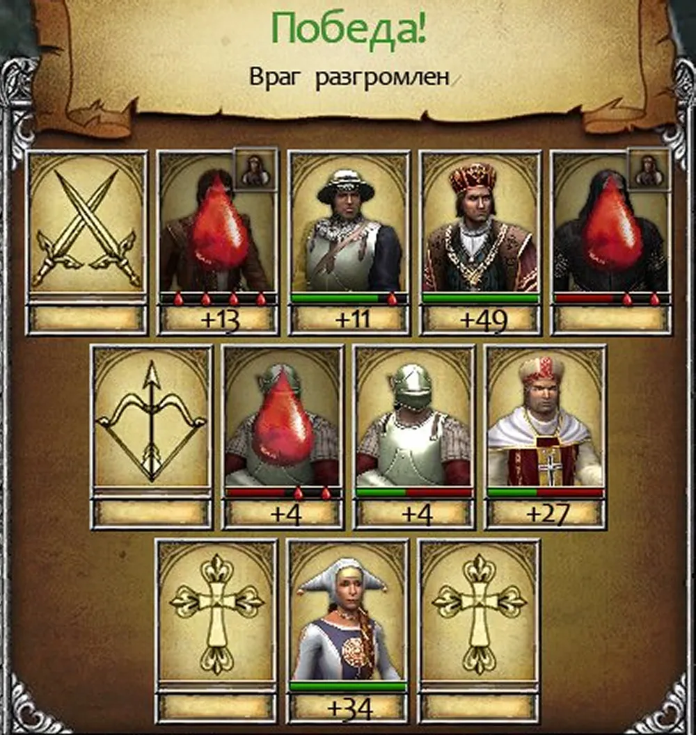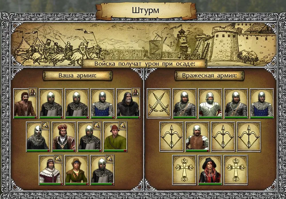 Забрав подкрепление, мистик заторопился назад и еле-еле успел; все ближайшие строения были захвачены, враг подбирался к самому замку. Штурм отбит, наняты арбалетчики и копейщики; за сохранность замка можно не беспокоиться. Пока молодые дворяне «охраняли» шатёр мага, набираясь опыта, их соратник пехотинец успел побывать во многих стычках и поднял свой статус до пикинёра. Ринсвинд не стал переводить его вторую шеренгу, а, вручив копьё, оставил на переднем краю – так лучше.