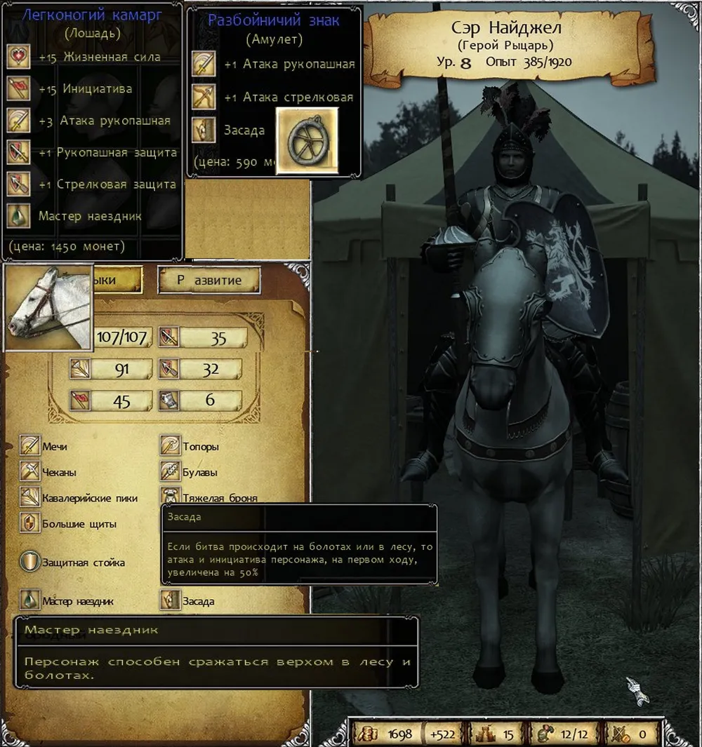 Почему именно в рыцарей, а не в паладинов? Разумеется, паладин вообще ничего не боится, в бою становится более могучим, чем остальные воины: прибавляя свою волю к защите и атаке. Но он с презрением отворачивается от многих предметов экипировки, не желает отравлять врагов или выкачивать из них жизненные силы, не берёт в руки чеканы – бесчестное оружие! – и слышать не хочет об участии в засадах. Словом, чересчур капризный воин. Поэтому герой сделал ставку именно на рыцарей и после одного из боёв добился своего.