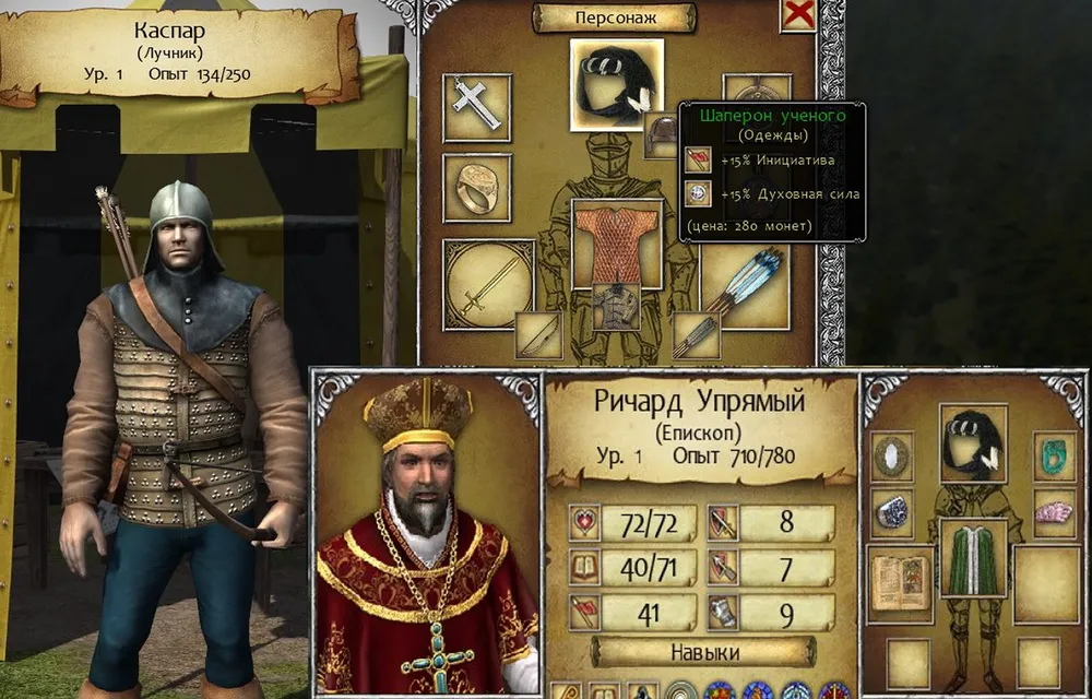Нужно было лишь следить, чтобы епископ вступал в сражение раньше всех, чего удавалось добиться с помощью предметов экипировки. В этих заботах – о повышении инициативы епископу – герой обнаружил, что головной убор священника прекрасно повышает инициативу лучникам и любым другим бойцам. Неплохо!