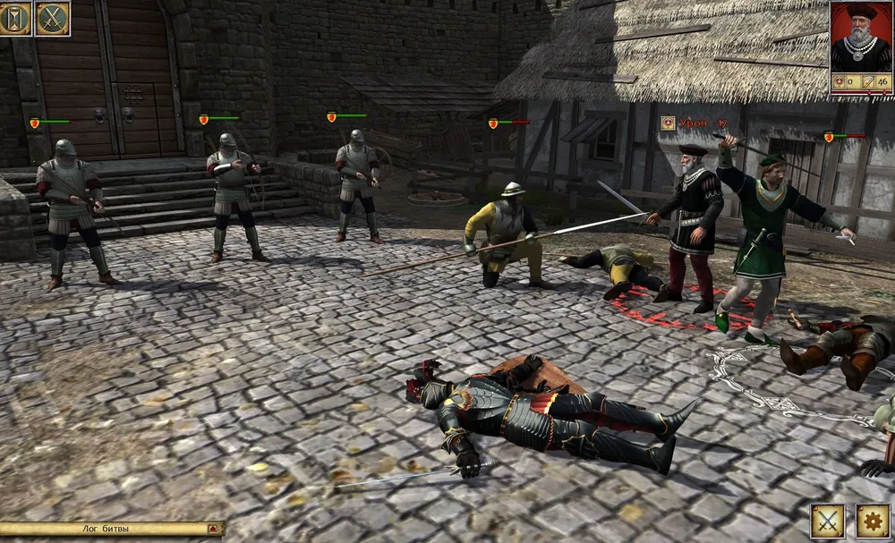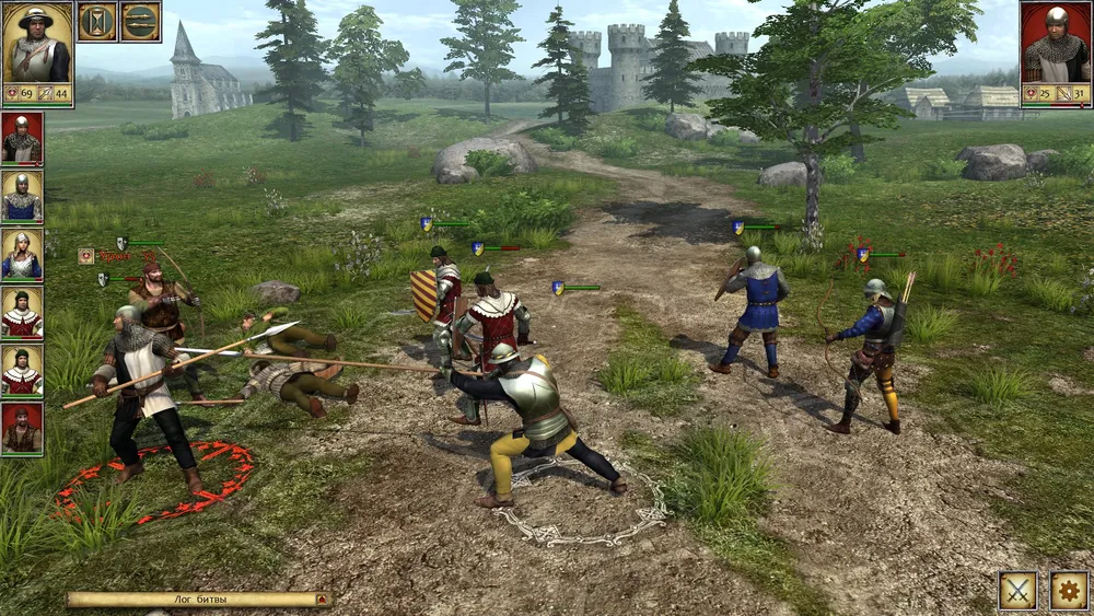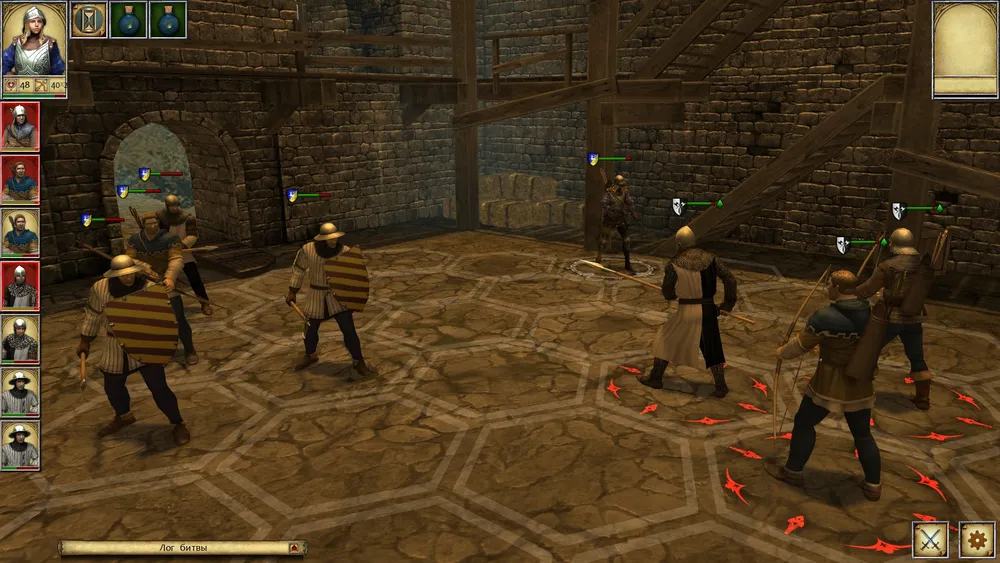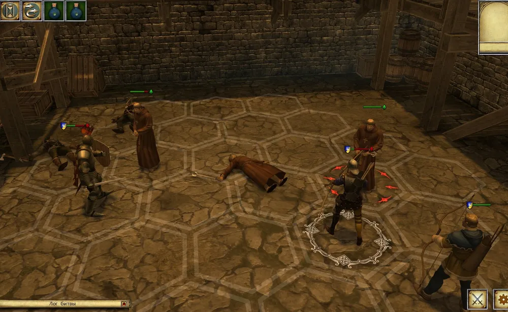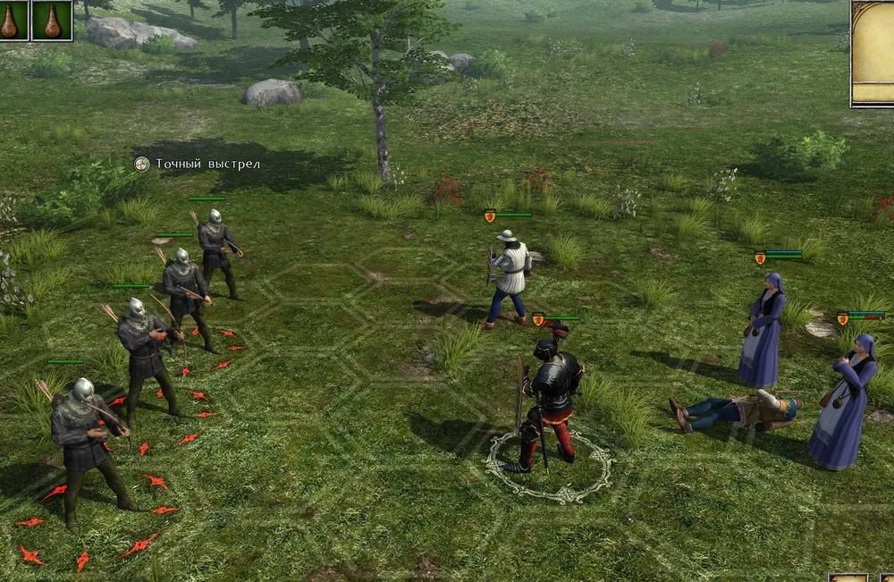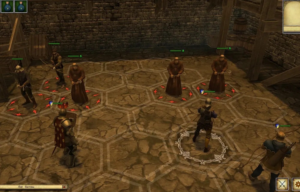 Рыцарь блокирует наиболее опасных врагов, первым делом уничтожаем лучника, за ним - воина в шлеме.