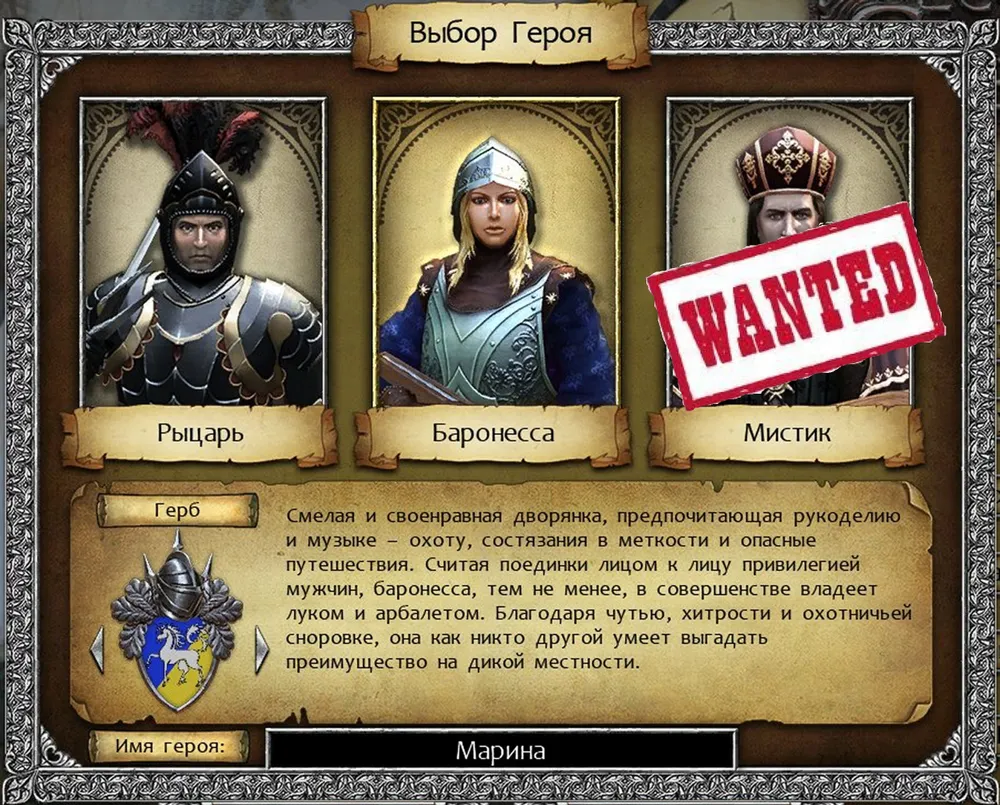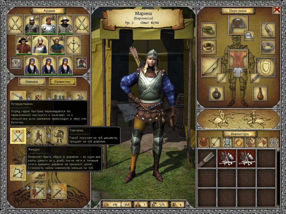 Но какие способности лучше выбрать при повышении уровня? Перовые три и для Баронессы, и для Рыцаря: «Феодал», «Путешественник», «Торговец». Первая позволит собирать дань сразу за неделю; не нужно будет ежедневно объезжать владения. Вторая даст возможность быстро перемещаться по болотам и лесам, что совершенно необходимо при преследовании слабого врага или убегании от сильного. Третья позволит дешевле покупать и дороже продавать. Об остальных способностях поговорим позже.