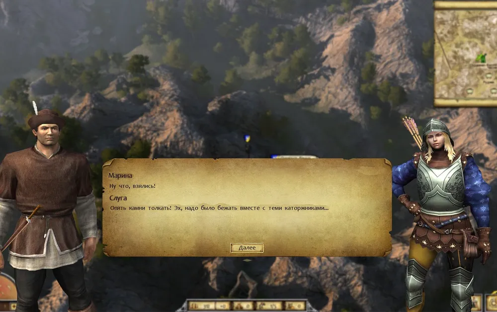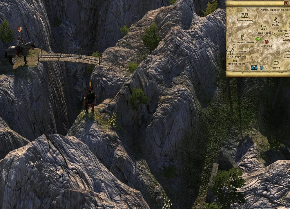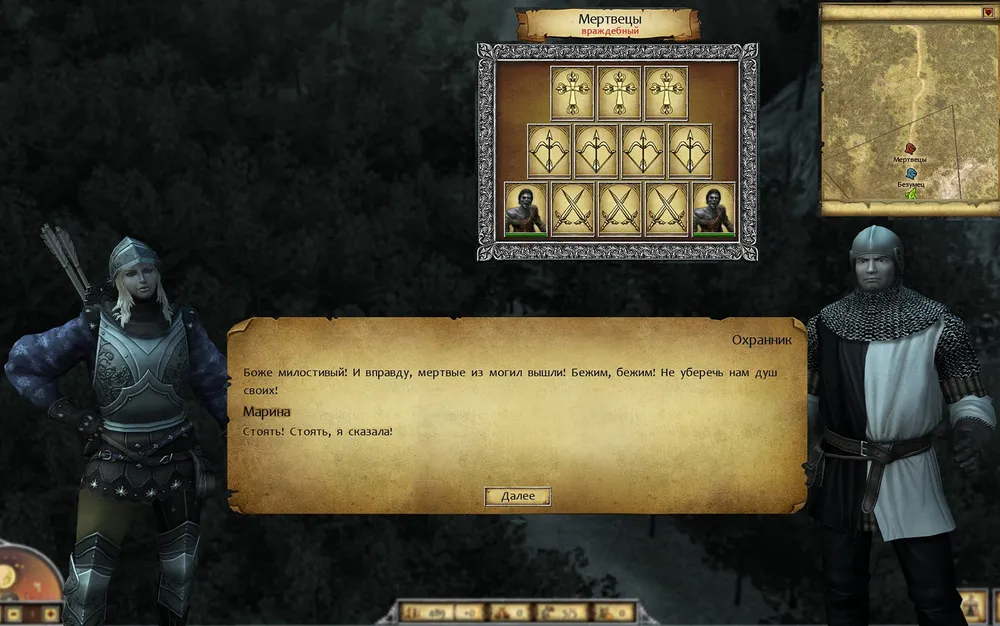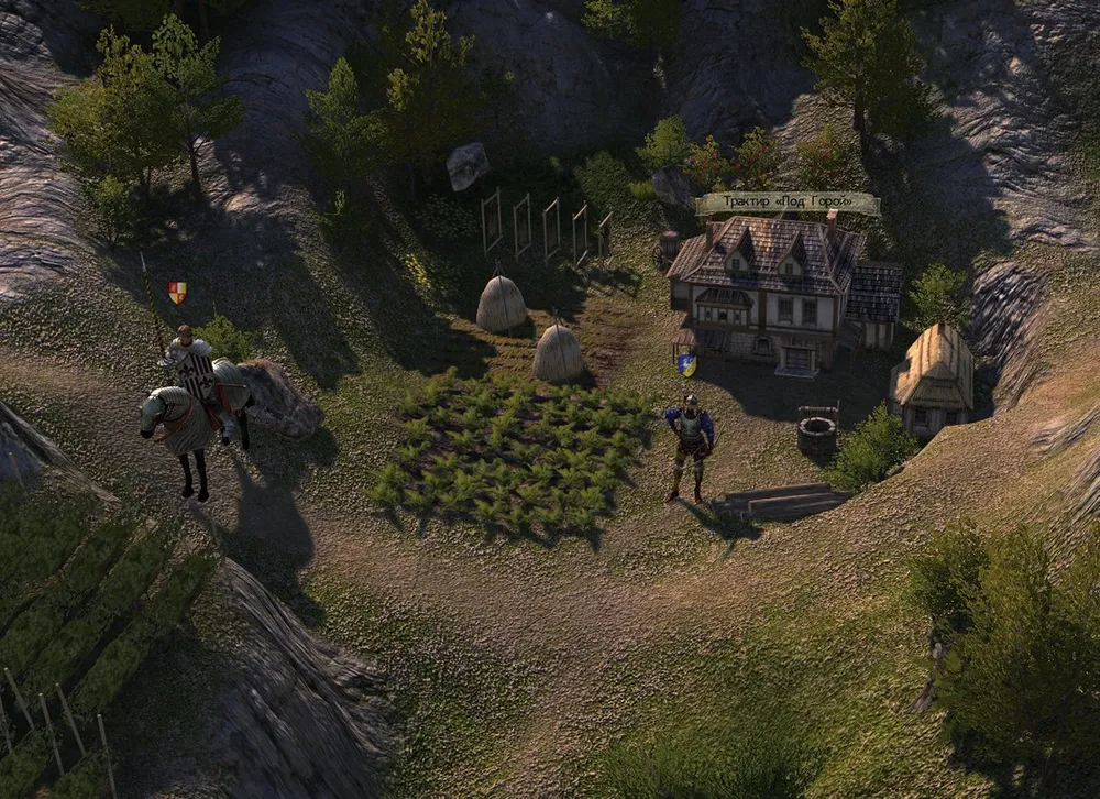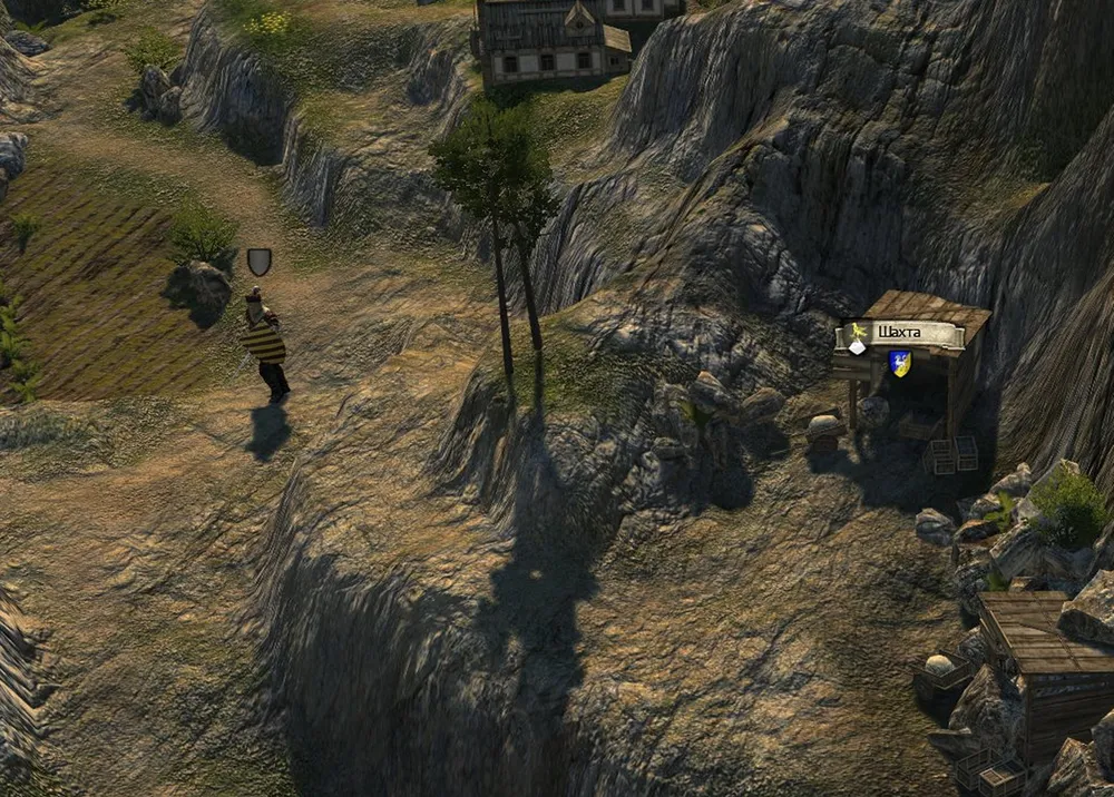 Выставляем скорость игры не более 1,5, сохраняем игру в отдельный слот (это необходимо делать после каждого этапа!) и начинаем. На нашем пути встречается рыцарь, который – вот чудо! – относится к герою доброжелательно, да ещё и подарки дарит. Бегом к нему в замок, нанимаем двух стражников и лучника. Затем в деревню, разговариваем со старостой и нанимаем клирика. Теперь обследуем шахты: медлить нельзя: проклятый Бертольд наступает на пятки.