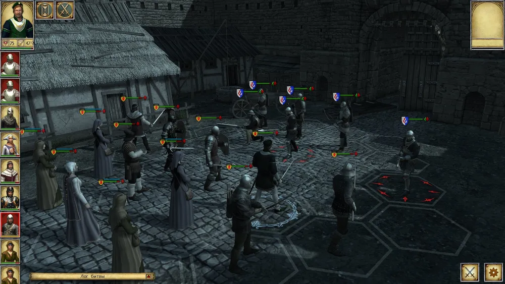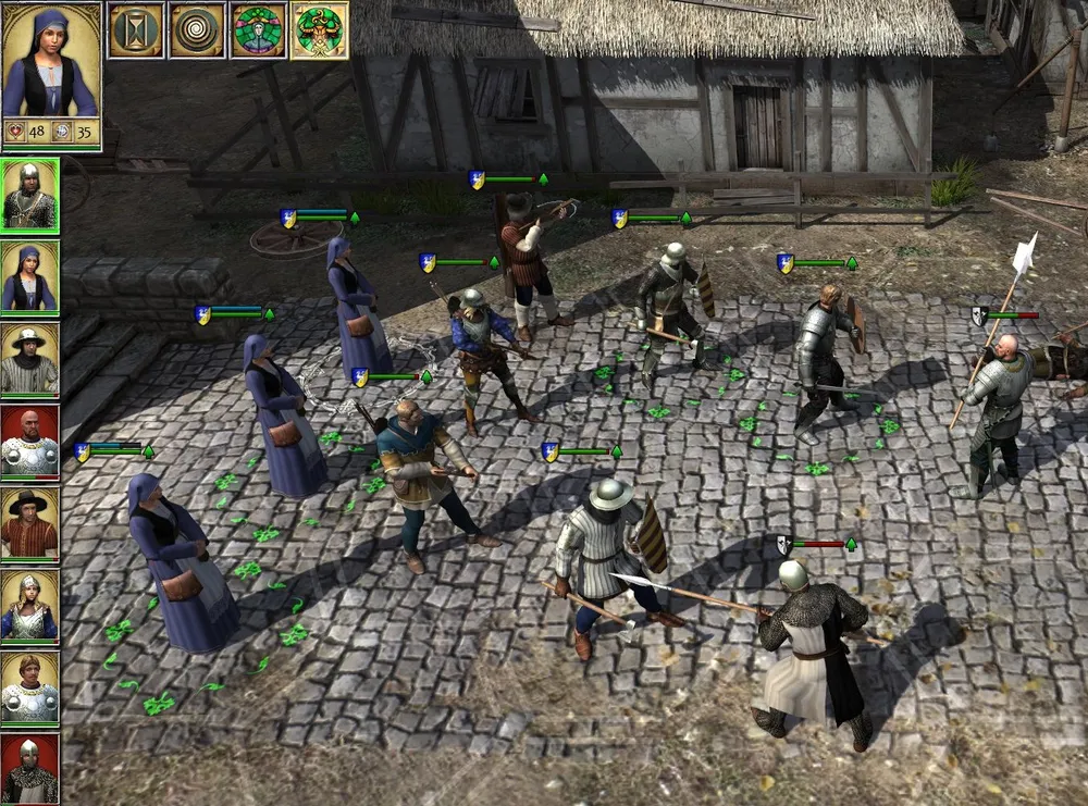 Кончились учения, кончилась практика; вы впервые удостоены чести принять участие в бою в качестве одиноких героев.… И Рыцарь, и Баронесса остаются без спутника: коварный Бертольд покидает их. Спасибо, что хоть экипировку оставляет. А впереди – отряд крестьян, запросто расправляющийся с командирами без войска. Выход один – бежать. Бежать в направлении собора; глава которого чрезвычайно обрадуется появлению защитника. Монахи помогут выиграть первый бой; но для следующего, ночного, на церковном кладбище, следует нанять бойцов. Кого нанимать? Два рукопашника вполне способны заблокировать первую линию, не допустив врага к лучникам. Но долго они не продержатся. Оба героя также должны встать в первый ряд: пока противник слаб, Баронесса легко переносит удары дубин и вил.