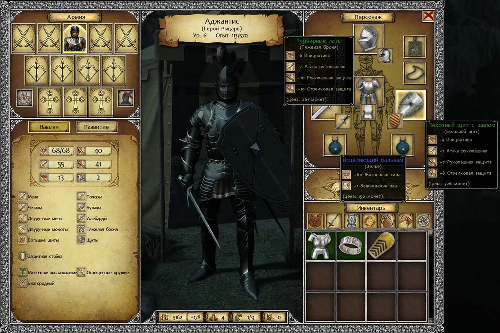 Едва не забыл – герои успели поднять уровни, что взять из умений? Лучница взяла «Стрельбу в упор» и «Пристрелку», последняя увеличивает урон при стрельбе по одной цели. А вот с рыцарем я, кажется, «накосячил»… «Железное здоровье» позволяет игнорировать первый вражеский удар; следующим надо было брать «Верховую езду», а я дал рыцарю «Двуручное оружие». Удар-то будет мощным, но инициатива - никакая. То есть сначала герой получит по удару от каждого врага, и только потом нанесёт свой. Впрочем, проверить, ошибся я или нет, пока что возможности не было.