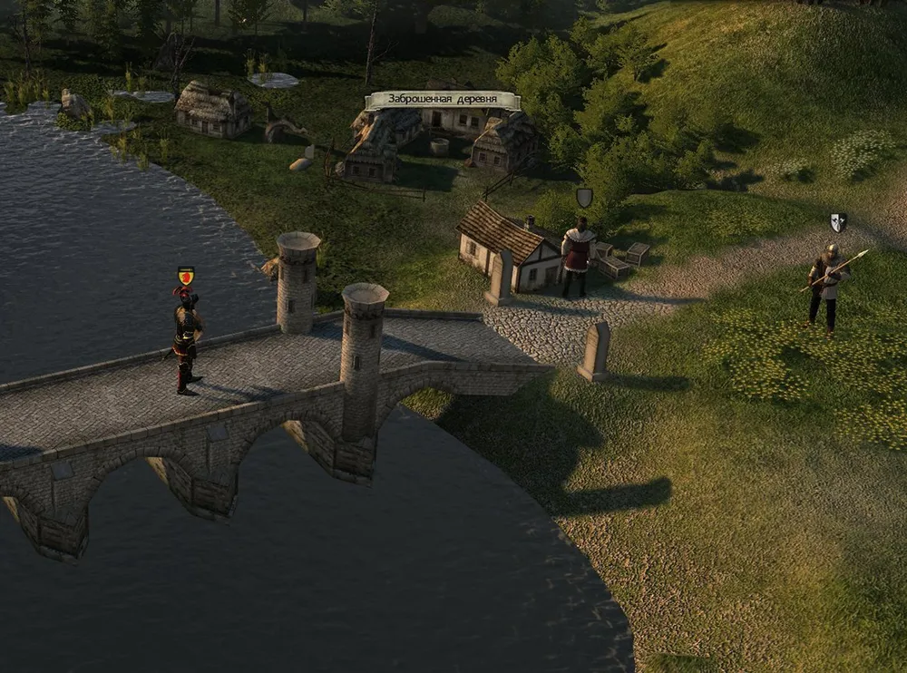 Как я уже говорил, бойцы, сидящие на вышке, потихоньку растут в уровнях. Постепенно наступает момент, когда лучник должен либо превратиться в арбалетчика, либо следовать путём мастера быстрой стрельбы. Повышение должно проходить под вашим контролем! Поэтому извлекаем из казармы всех бойцов, вплотную подошедших к «развилке» (важно, чтобы осталось не более тридцати очков!) и бежим на мост у города. Как только тень от вышки на другом берегу коснётся дороги, у моста появится злодей, заставлявший крестьян грабить могилы рядом с собором.