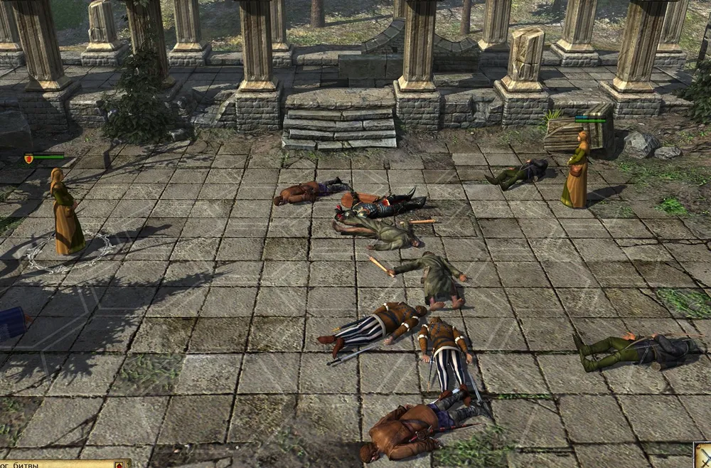 Если повезёт натолкнуться на конного наёмника (мне повезло пока один раз), то после боя у него можно забрать коня и копьё. Пустяк, а приятно – золота вечно не хватает. (Надеюсь, что это не баг.) К слову, иногда всадник, под которым убили коня, поднимается и вступает в рукопашный бой.