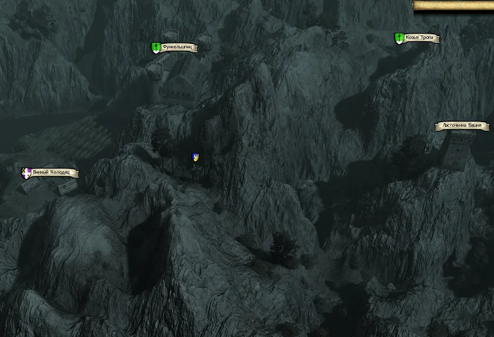 Проходим ворота – войско всё ещё сидит в башне. (Угу, войско из четырёх бойцов. Враги в ужасе.) Покупаем в кузнице три набора инструментов, одно руно в церкви и четыре полотна в деревне. Также закупаем у кузнеца оружие и экипировку, могущую послужить вашим воинам. Проверяем легенду о семи рудокопах.