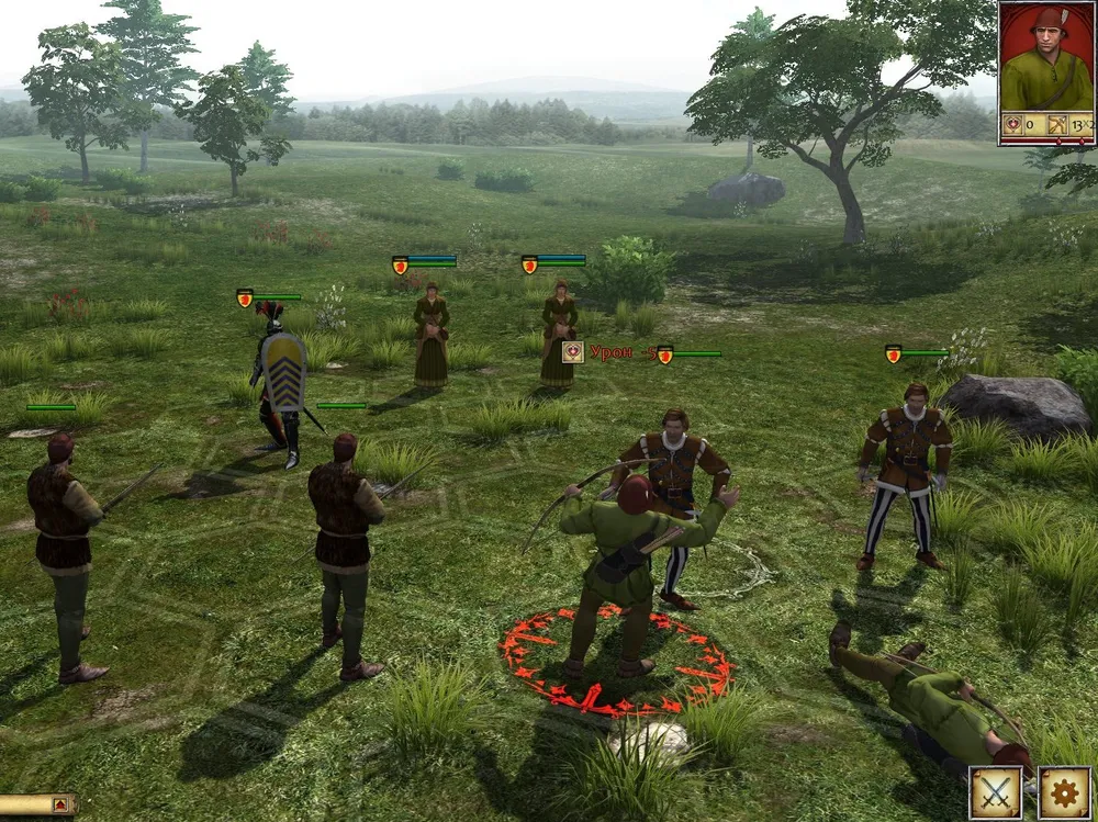 Враг подл, и первые свои стрелы выпускает именно в медиков. Получается неприятная картина: доктора уничтожены, а отбиваются от врага два-три бойца. Сумеют ли отбиться? Ещё одна неприятная «фишка»: с ростом уровня у клирика появляются дополнительные заклинания. Которые почему-то нельзя зафиксировать; в активной позиции, готовой для применения, всегда находится последнее приобретённое. В горячке боя вы отдаёте приказ полечить раненого, а клирик применяет усиливающее заклинание. Необходимость постоянно следить за этим вызывает, мягко говоря, недовольство. Если я не ошибаюсь, в лечении воина клириками во время затянувшегося боя таится грозная опасность потерять его навсегда. Если персонаж теряет более половины базового здоровья за один удар, то получает ранение. Его вылечивают. Следующий удар - ещё половина здоровья. После четвёртой раны вы получите труп.