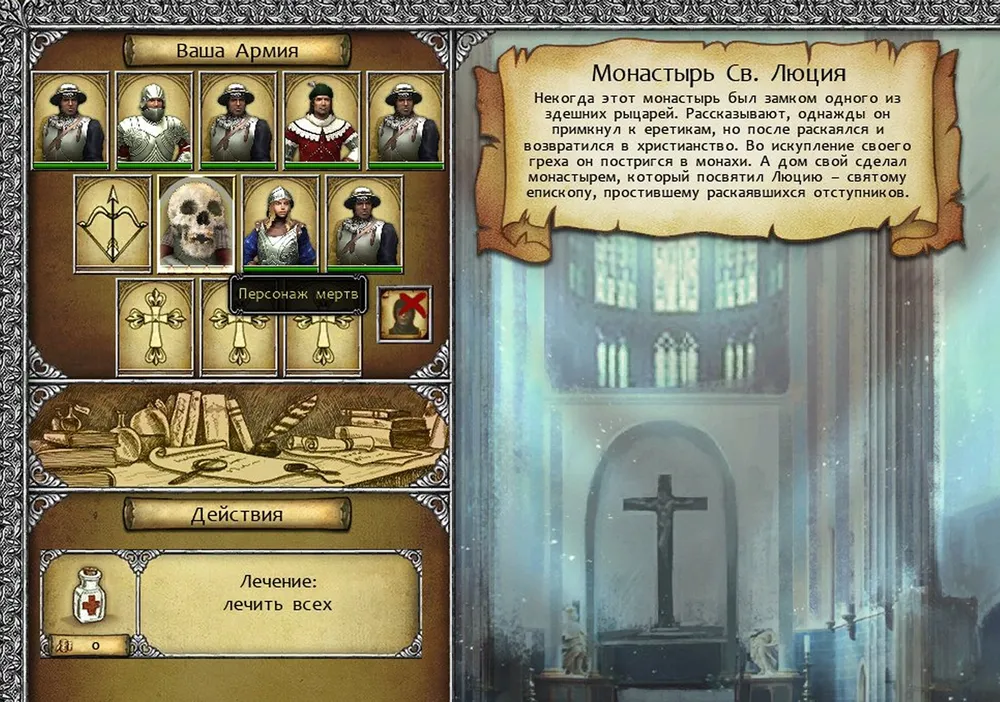 Вернёмся к первой миссии. Купили экипировку, заглянули в зубы коню и пошли в храм, нанимать священника. А зачем? Это на первой карте количество бойцов в отряде почти не ограничено, а на следующей их будет всего пять, включая главного героя. В итоге воевать будут только трое: клирик лечит, а священник – усиливает. Лично я всегда предпочитаю взять в отряд ещё одного активного бойца вместо «усилителя». Поэтому о священниках – больше ни слова. (Если только не вынудят брать их в войско по сюжету.)