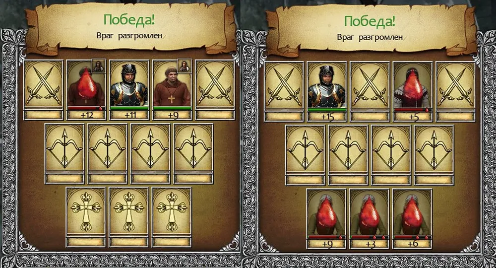 Воин в шлеме атакует лучника во втором ряду и убьёт его; Баронесса тоже будет блокирована и погибнет под ударами топоров. Две стрелы в защищённого врага; Баронесса выдержит два удара и добьёт врагов - пройти к лучнику они не сумеют. А если не выдержит, их добьёт лучник; Баронесса всё равно воскреснет.