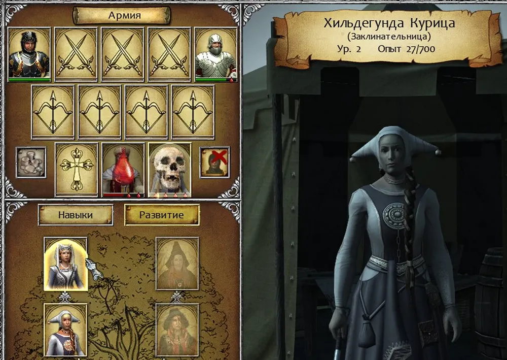 Какое умение больше пригодится баронессе при последнем повышении уровня? Выбор не так велик… «Точный выстрел»?! Пропуская ход?! При том, что у неё и без того нет достойных противников? Нет. «Арбалет»?! И выпускать стрелу не первой, а последней, а тем временем колдуны и вражеские стрелки уполовинят отряд. Нет. Увеличить точность дальнего выстрела? Хорошо бы… Но, учитывая, что в ближайшем будущем отряд не удастся укомплектовать сильными воинами, а рыцарь только один – надо брать «Лидера», пусть будет на одного соратника больше. (Решать, конечно, вам.)
