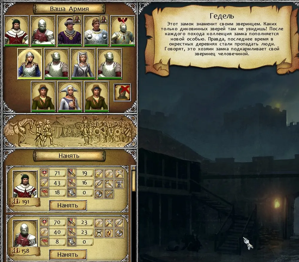 То есть, торговцы, по своему обыкновению, предали недавнего союзника: должно быть, соблазнившись посулами канцлера. Нанять более-менее приличных бойцов можно только в одном месте – замке Гедель. Причём эсквайр появляется там далеко не сразу; неплохо к этому моменту добыть коня, седло и копьё.