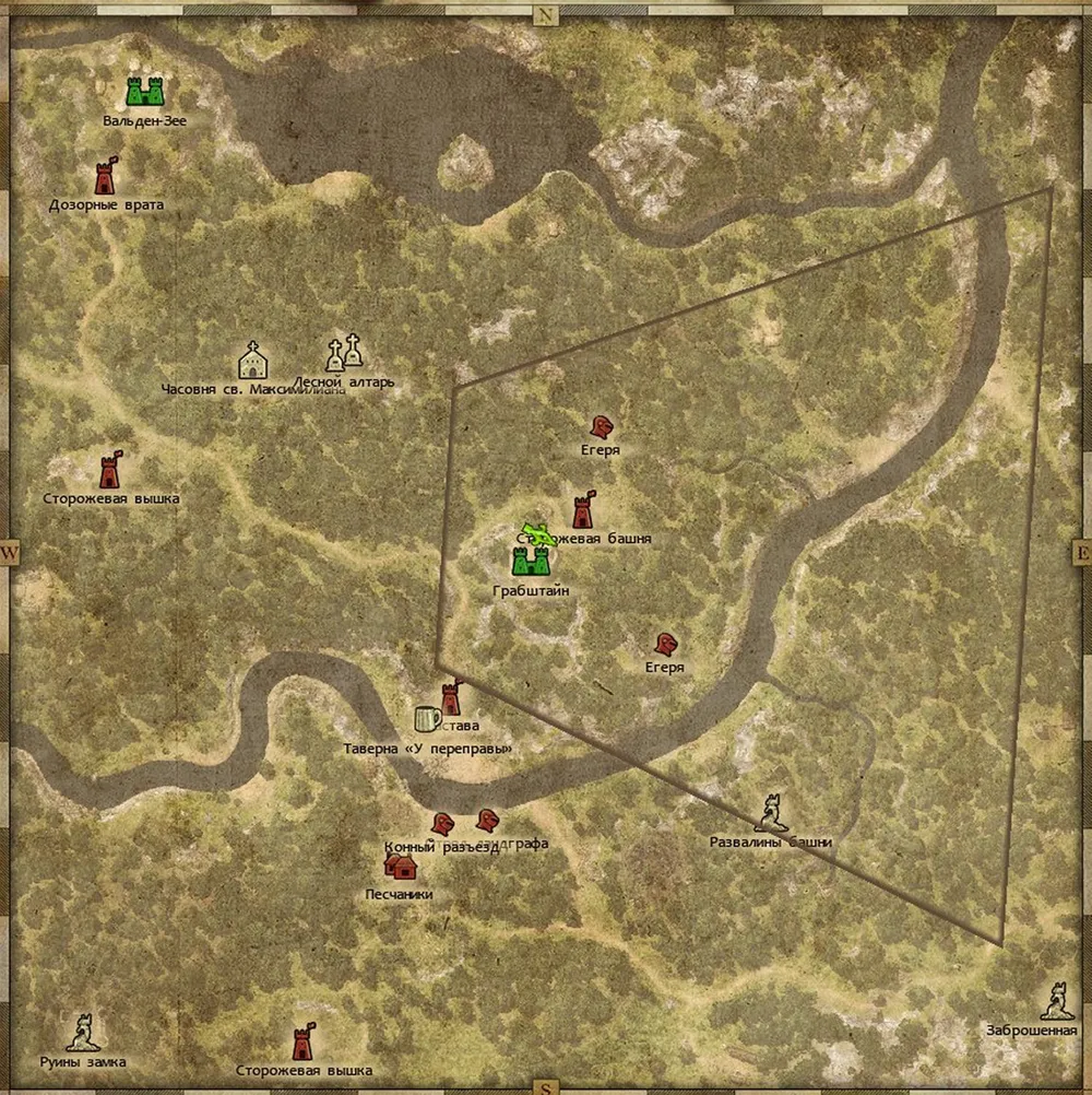 Поскольку на следующую карту можно взять с собой двух спутников, следует озаботиться их экипировкой. Самая большая проблема - лошади; их нет в продаже. Командир одного из вражеских отрядов разъезжает на камарге – первый конь получен. Второго вы добудете после сражения с войском ландграфа, там же получите волшебные стремена, позволяющие не спешиваться в лесах и на болотах. (Конечно же, спутниками героя должны быть рыцари!)
