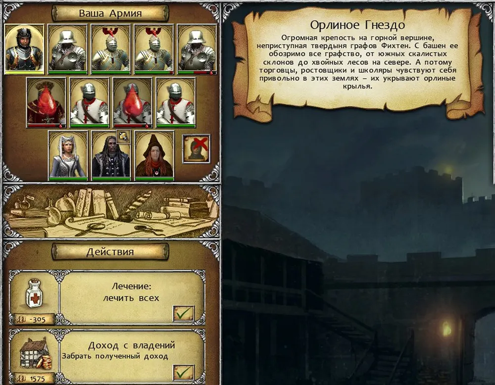 Рано или поздно наступит момент, когда герою предложат убить Урсулу; причём её сын Томан в обмен за помощь попросит вернуть три захваченных героем замка. Вот оно! Заполняем все три замка лекарями и священниками, но в строгой последовательности. Сначала усадьбу, затем замок Кельзитце, после чего передаём его под контроль Фихтенов. Усадьба сам перейдёт под власть Фихтенов, – не забыли? - и вы лишитесь возможности разместить в ней гарнизон. Сначала заселяем дозорную вышку на берегу, затем – замок Флак.