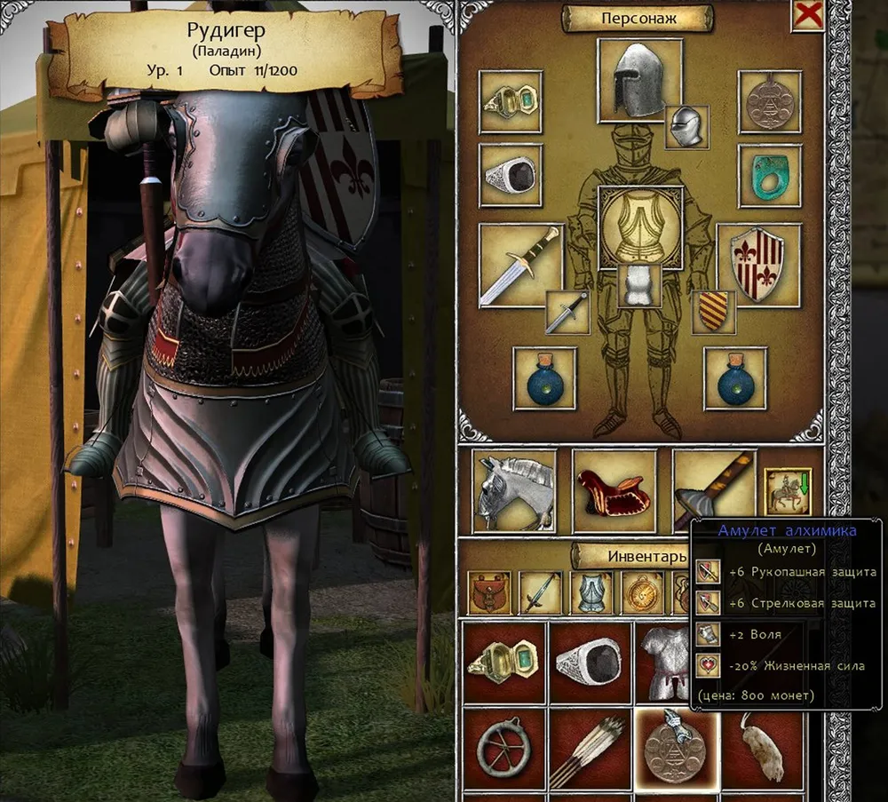 Если вам повезёт найти «Егерскую шапку», то светлый всадник снисходительно кивнёт головой и согласится экипировать её: колпак - не амулет, почему бы не надеть? Славно, одно место освобождается. Это тем более важно, что паладин не желает носить «Чумную маску», а магическое восстановление необходимо. Забираем у героя «Чёрное ожерелье»: одно из мест в экипировке паладина будет занято им, второе – амулетом «Кошачий глаз», третье – амулетом «Святые мощи» (защита, +3 воля, освящённое оружие). Остаётся место для «Перстня отравителя», либо для вампирического перстня, либо для «Амулета алхимика» – решайте, что вам нужнее.