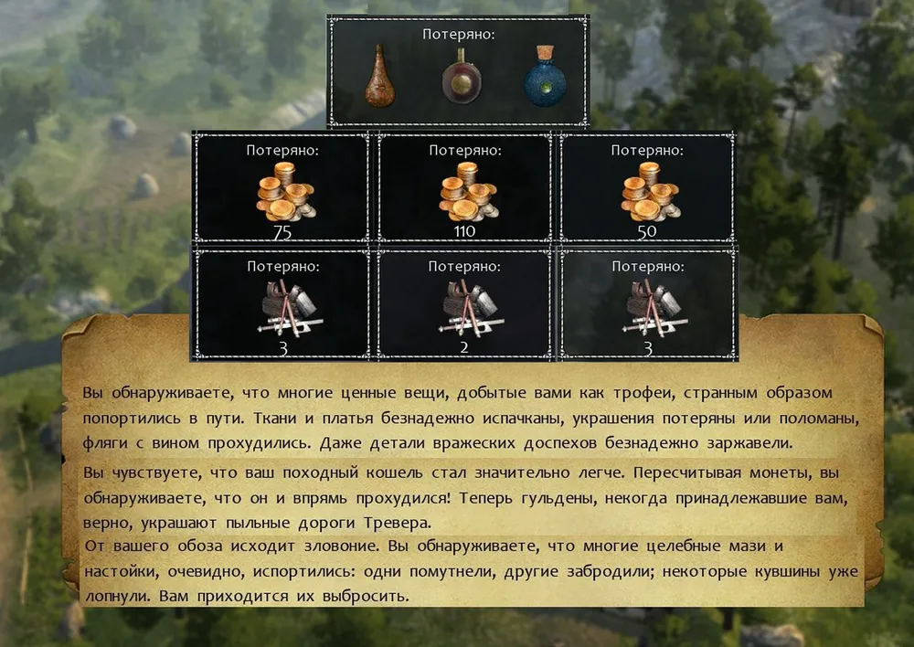 К этому моменту нужно передать самые полезные предметы экипировки паре бойцов и оставить их в замке. Неплохо заполнить рюкзак героя (Рыцарь с рюкзаком, в котором помещаются даже боевые кони! Круто!) большим количеством трофеев. Разъезжаем туда - сюда по карте и наблюдаем, как из рюкзака героя пропадает металлолом, малоценные зелья и золото.