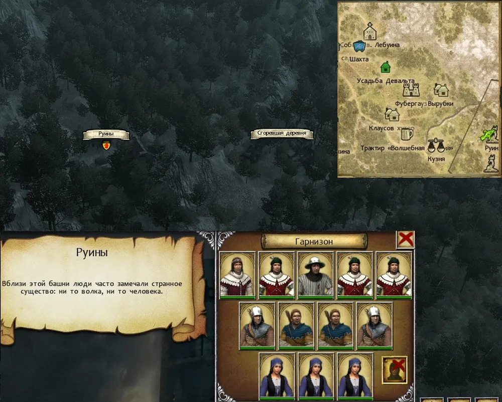 Начинаем с задания «Охота на оборотня». Первая ночь не принесёт результата, а во вторую оборотень попадётся. (Я не успел это проделать, но если герой соединится со спутниками в башне и выйдет наружу до подхода монстра – получит преимущество; рыцари будут верхом.)