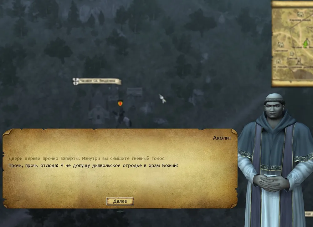 Когда Рыцарь, Баронесса и Мистик заметят, что дело неладно – спешим в собор св. Лебуина, оттуда – в ближайшую таверну и, выслушав слухи – к развалинам церкви (они будут отмечены на карте). Осталось выдержать четыре боя, и задание будет выполнено, причём без особых материальных потерь. Удачи!