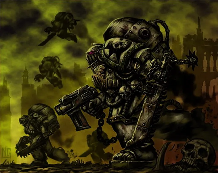 Флот Гвардии Смерти, который вышел из варпа в конце путешествия к Земле, мало напоминал тот флот, который вошел в него. Сияющие бело-серые доспехи Имперских Чемпионов потрескались и частично разрушились, не в силах сдерживать полусгнившие тела десантников Нургла, наполненные разложением и болезнями. Их оружие и военные машины теперь наполнились болезненным колдовством Хаоса, многочисленные демоны роились вокруг их танков и пушек, покрытых слизью и гноем. Само имя Легиона, Гвардия Смерти, отошло на второй план, оно более не отражало того ужаса, который шествовал по мирам Империума. Для своих врагов, для своих союзников, и даже для самих себя, Гвардейцы Смерти стали Чумными Десантниками.