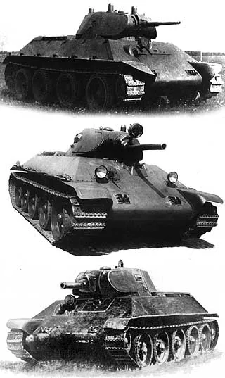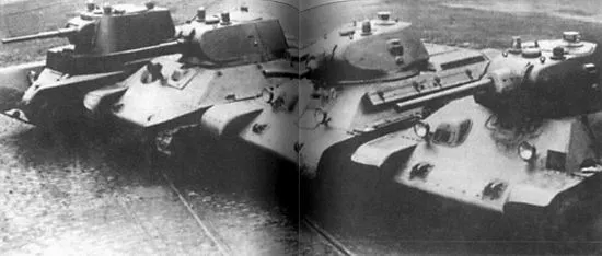 Слева направо: А-8 (БТ-7М), А-20, Т-34 обр. 1940 г. с пушкой Л-11 и Т-34 обр. 1941 г. с пушкой Ф-34.