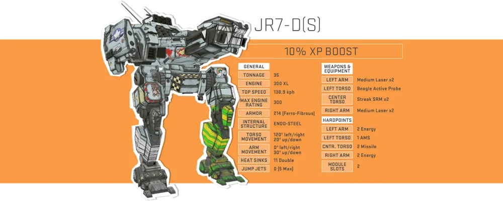 JR7-D имеет хороший подбор слотов; четыре энергетических в руках и два ракетных слота в центре торса, что позволяет ему воспользоваться оружием с наибольшим соотношением веса-к-урону, такие как, средние лазеры и SRM. Все варианты имеют AMS в левом полуторсе.