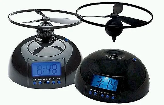 Работает это дело довольно интересно. Когда часы достигают установленного вами времени, база начинает издавать крайне раздражающий звук, а пропеллер (тот самый, который прикреплен к верхушке базы) приходит в рабочее состояние и взлетает, начав хаотично перемещаться по всей вашей квартире (читай персональный Карлсон, разве что варенья не требует). Наиболее забавной фичей этого девайса является то, что для того, чтобы отключить звук будильника, вам нужно будет встать (по другому никак) и поймать летающий пропеллер, прикрепив его на законное место. Таким образом, у вас нет выбора, кроме как пересилить свою лень и идти ловить его. В отчаянных попытках отключить летающий будильник, вы даже не заметите, как уже совсем проснулись! Судя по всему, это просто прекрасный подарок для тех, кому часто приходится вставать по утрам, а так же тем, у кого процесс “просыпания” вызывает большие проблемы.