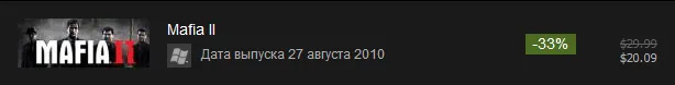 Стоимость обычной версии Mafia II со скидкой составляет 0.09. Напомню, что без скидки игра стоит намного дороже, а именно 9.99. Скидка довольно выгодная, но есть предложения ещё лучше!