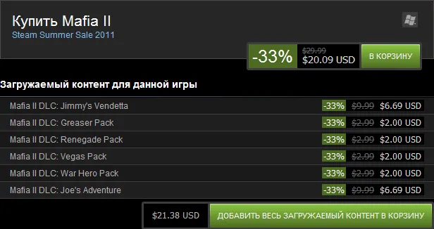 Издание - Mafia II Digital Deluxe составляет 6.79! В состав этого издание в ходят все длс и паки, которые выпускались для игры, разумеется кроме made man pack, он был только в коллекционном издании игры на компьютер. Список полного содержания смотрите ниже. Стоимость такого издания без скидки - $39.99. Подумав, эти скидки очень выгодны! Так, что покупайте! Ведь в магазинах вроде Озон или 1С в целом с игрой и длс стоит около 1000 рублей!