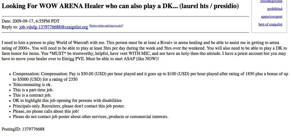 Объявление уже удалили. Возможно это был фейк, но я не удивлюсь если нет. Человек при деньгах с завышенным ЧСВ и неровными руками решил в сжатые сроки удовлетворить свои желания и найти хилера, который протащит его до . Ведь как известно,