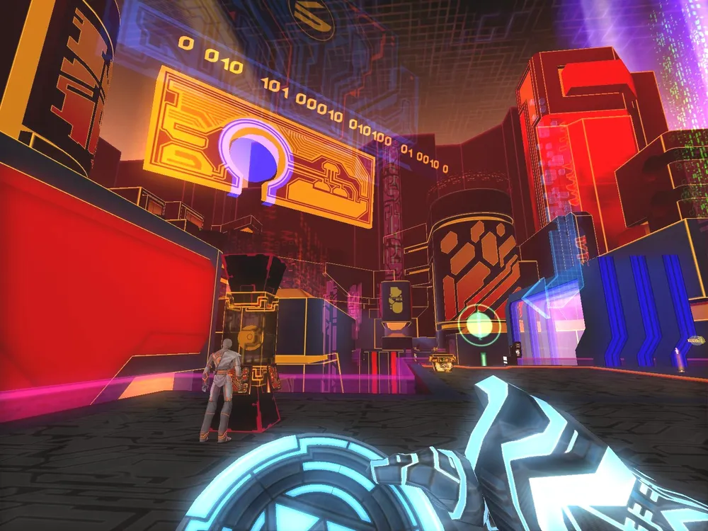 Для борьбы с противниками у героя есть уникальное оружие-"троян" в виде обычного бластера, которым мы стреляем по охранникам в светящихся красных скафандрах. Хотя это не просто охранники, а управляющие файлы операционной системы. После мы подбираем "аптечку", которая также на самом деле не аптечка, а программа быстрой дефрагментации. Но главным нашим оружием на протяжении всей игры остается управляемый метательный диск. Левая кнопка мыши — запуск диска, правая — возвращение, кнопка, зажатая на долю секунды — управляемый режим. Все просто и сложно одновременно - кроме обычного полета по прямой, диск "отражается" от разного ода поверхностей, и если вам удастся набить руку в его использовании, то диск может стать оружием массового уничтожения.