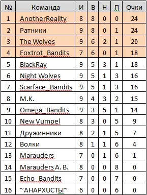 Команда AnotherReality снова вырвалась на первую строчку нашего рейтинга. Однако в спину ей дышит группа Ратники, которая может потеснить лидера уже на десятой неделе. За обладание четвертым местом спорят Foxtrot_Bandits и BlackRay, заработавшие по 18 очков. Турнирную таблицу замыкают три состава — Marauders A. B., Echo_Bandits и ~AHAPXUCTЫ~. У них число сыгранных матчей совпадает с количеством поражений.