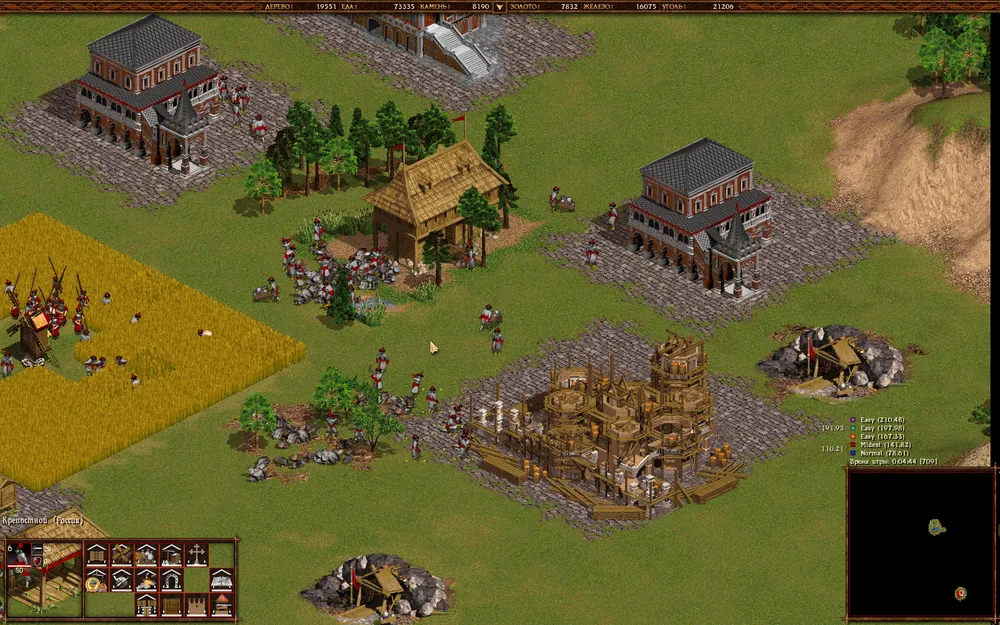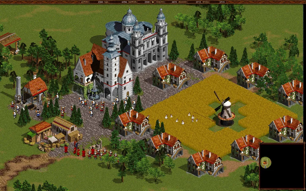 Ресурсов у нас шесть видов: дерево, еда, камень, золото, железо, уголь. Последние три добываются в шахтах, которые нужно строить в определенных местах. Дерево и камень добывают на свежем воздухе, где природа сотворила лес и, хм, кучи камней. Еду добывают крестьяне в полях, растущих вокруг мельницы, и рыбацкие лодки, соответственно, в воде. Добыча ресурсов сделана, наверное, по самой стандартной схеме — у нас есть крестьяне, которые и добывают нам все виды ресурсов — от еды до золота. Ресурсы постоянно расходуются и на содержание. Бесполезных ресурсов нет: при отсутсвии еды ваши подданные начнут умирать, при отсутсвии камня и дерева вы ничего не построите, при отсутсвии золота взбунтуются наемники и ваши линкоры, при отсутствии угля или железа стрелки и пушки не смогут вести огонь. К счастью, есть рынок, но учтите, что цены там динамические, и скупая постоянно один ресурс вы рискуете очень сильно поднять его стоимость.