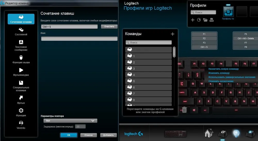 Дополнительные возможности клавиатуре предоставляет фирменная утилита Logitech Gaming Software, находящаяся на официальном сайте производителя. В программу входит набор готовых команд, выполняемых нажатием одной клавиши.