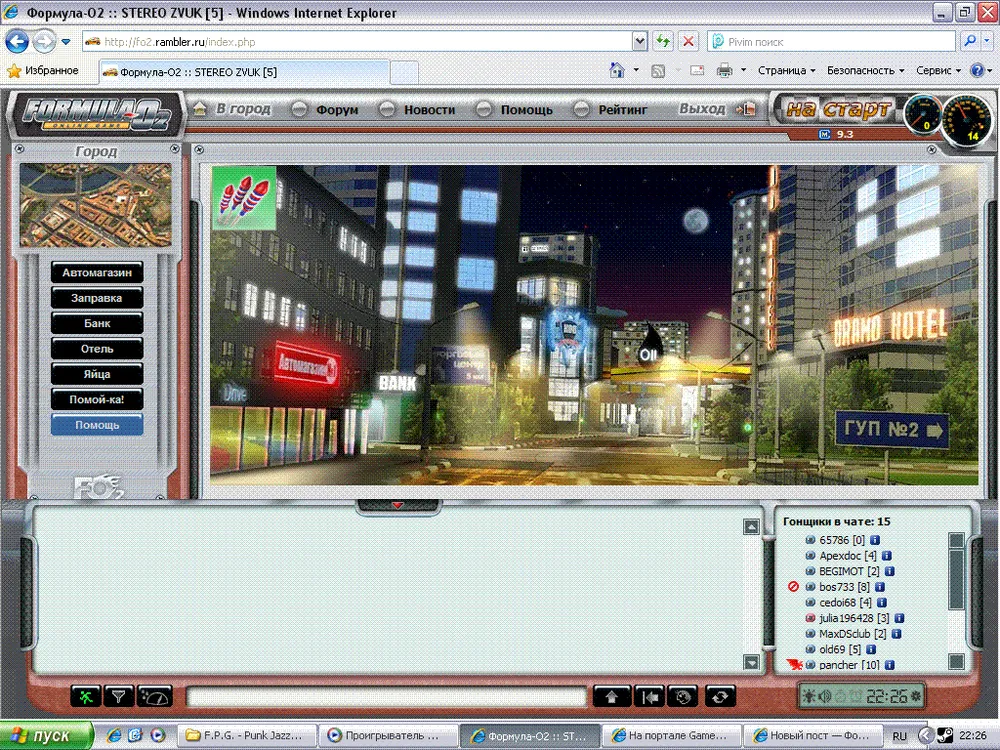 На самом деле всё происходило следующим образом. Вечер был удачен, ночь тяжела, а на утро (с похмелья) наткнулся на рекламу в инете (дай думаю гляну, что предлогают). Нажал на ссылку игры Formula-o2, глянул скрины, проматал видео, решил зарегится. Через один час друг меня просто не мог отарвать от компьютера, токой игры я ещё не видел (для онлайн игры через Internet Explorer Formula-o2 -=ВЕЛИКОЛЕПНА=-). Не могу не отметить её нассыщенность. Игра продуманна на все 100%, чего в ней нет, ну если кто подобное заметит, то пишите. В ней есть ВСЁ. Вообщем я нашел свою игравую пристань. Я уверен что со мной согласятся многие гонщики Formula-o2.