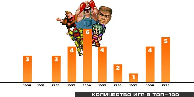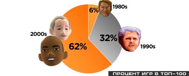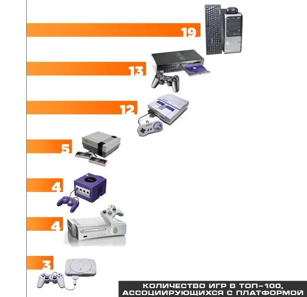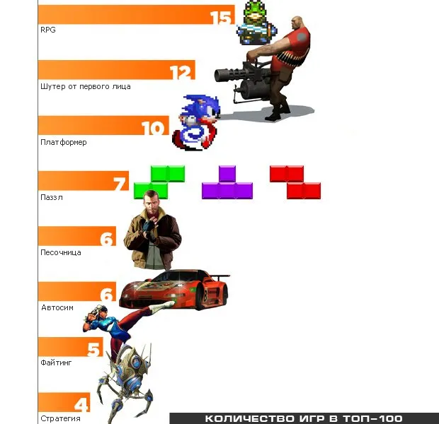 Самый известный и узнаваемый персонаж — вне сомнения, Марио. Усатого водопроводчика знают очень многие, даже те, кто никогда не играл ни в одну компьютерную игру. В топ жанров справедливо вошли RPG, FPS и, неожиданно, платформеры. Сказывается влияние консолей и вообще их популярность на западе. Лучшие игроделы рождаются и работают в Японии. Лучшие игры были выпущены в 2000-х годах (спорно, правда?), а конкретно — в 2005. В этом году появились World of Warcraft, God of War, Resident Evil 4, Gran Turismo 4, Need for Speed: Most Wanted, Psychonauts.