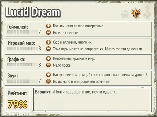 Игра очень насыщенная, как вы могли уже понять. И головоломки есть почти на любой вкус. Даже популярную тему управления временем игра Lucid Dream не обошла стороной, обыграв её по-своему. В игре три уровня сложности, я играл на последнем, и помощь мне понадобилась 2-3 раза (много, мог бы не лениться, да). Игра потребует от вас внимательности, небольшой усидчивости (длится Lucid Dream от силы 1,5-3 часа).