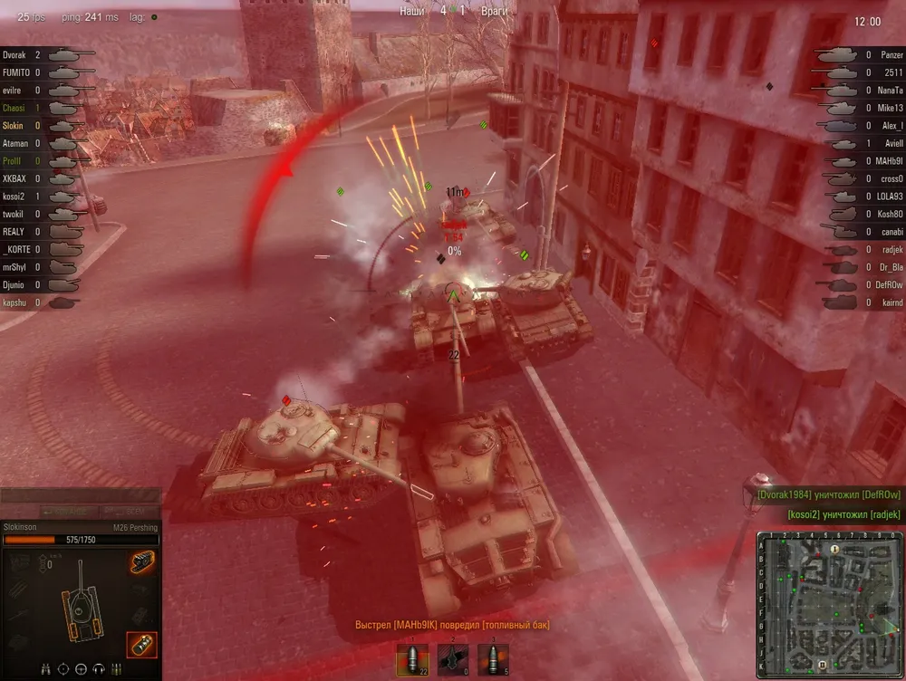 Ах да, насчёт пожароопасности. Если посмотреть на Першинг в игре – можно увидеть сзади такую маленькую выхлопную трубу, время от времени попыхивающую забавными чёрными облачками. Если это место что-нибудь пробьёт – М26 с очень, очень высокой вероятностью загорится. А сгорает машина обычно до самого нуля, вне зависимости от состояния на момент начала пожара. Иногда бывает и интереснее. Один из боёв мне пришлось провести с 7 закритованными модулями и 70 хп. Уже не помню, сумел ли я тогда кого-то убить. Но зато очень хорошо помню, как меня напугала встреча с вражеской Т-43, и как я сразу же, пыхтя мотором, начал энергично залезать за угол дома. Снаряд из Д-10т. Страшно…