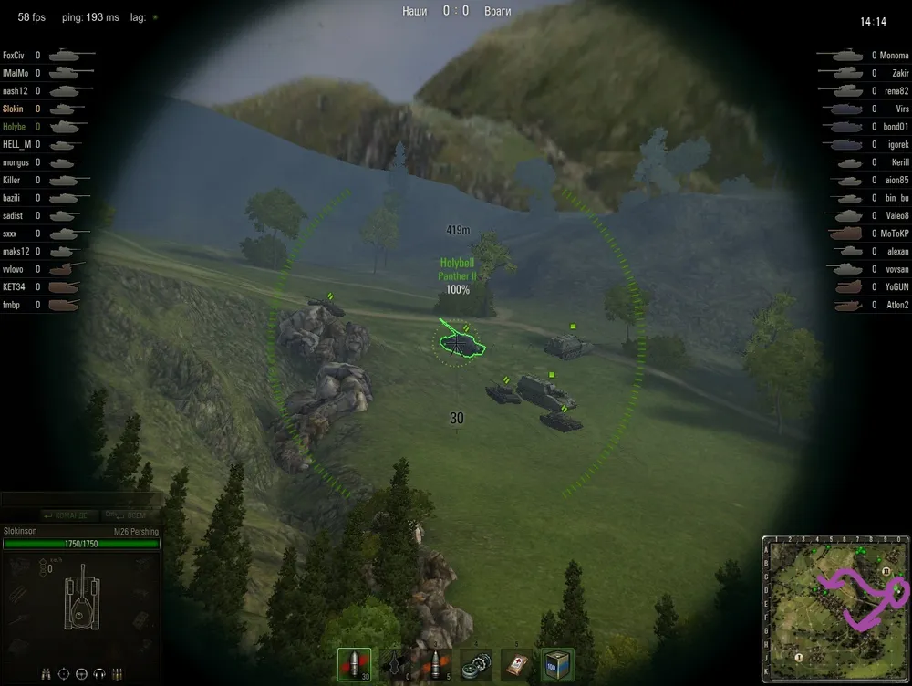 Першинг стоит и ждёт. Если впереди появляются противники – он по ним стреляет. Аккуратно. С как можно большего расстояния. Точность орудия вполне позволяет, хоть и не П2. С топ-орудием желательно целиться чуть выше гусениц любым мишеням – так противникам сбиваются для начала сами гусеницы, а затем наносится полный урон.